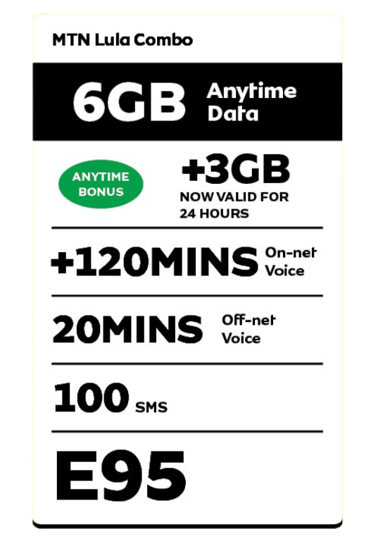 Get more data, more minutes, and more value with MTN Lula Combos — now with Anytime Data only (no day and night split), 24-hour bonuses, and bigger value on every plan.
